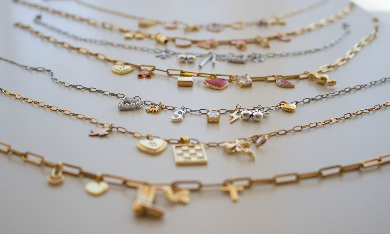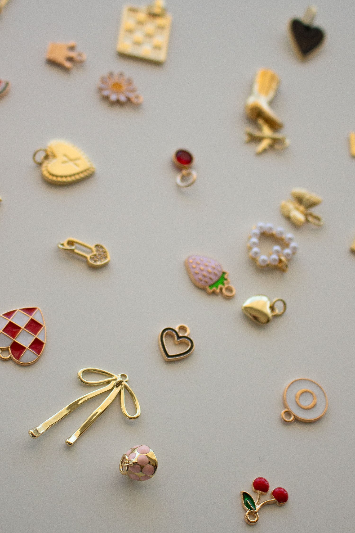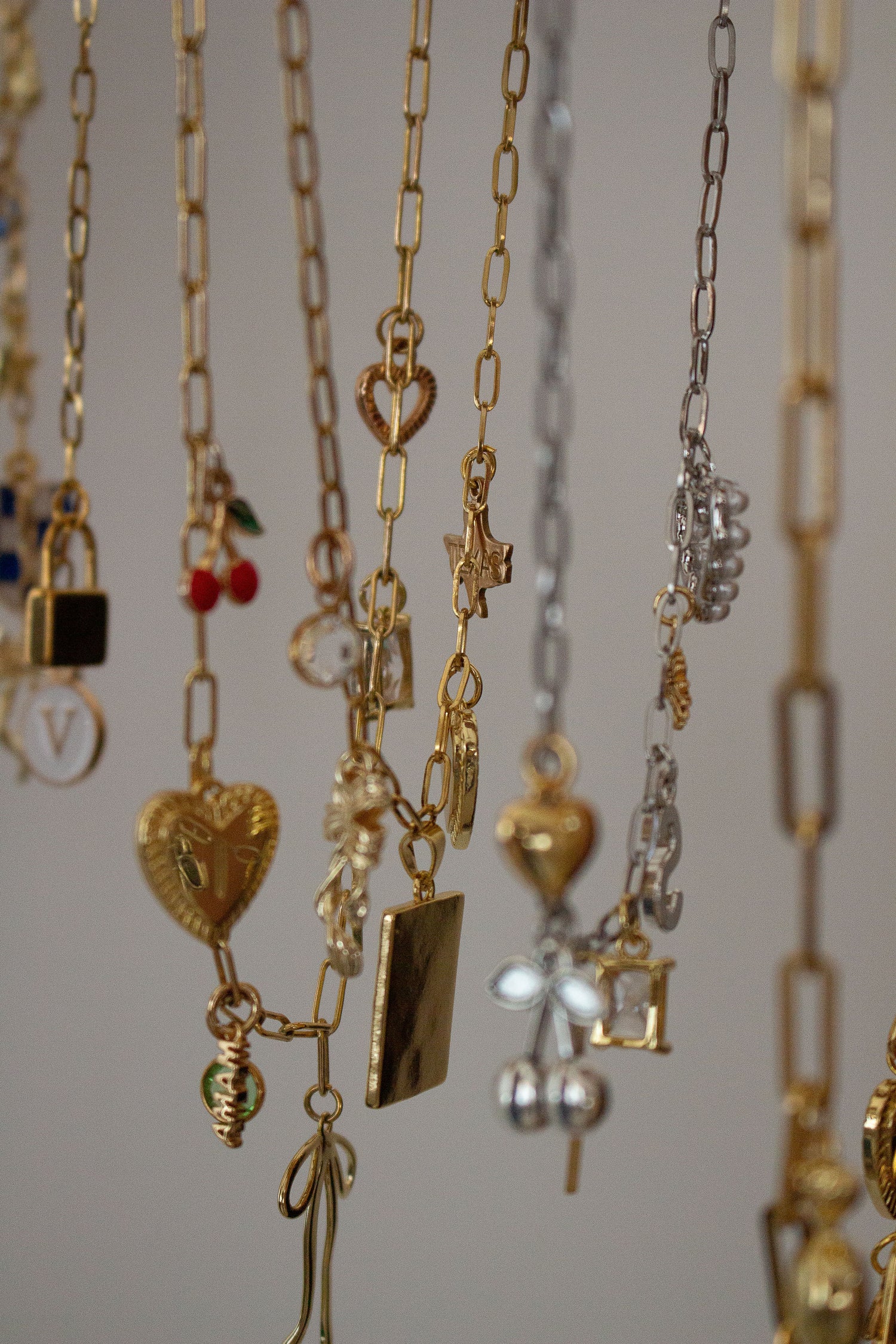 1. From left to right: pearl, bubble heart, lightning, checker pendant, letter, cowboy boot, dainty dotted bow. Spaced 3 links apart